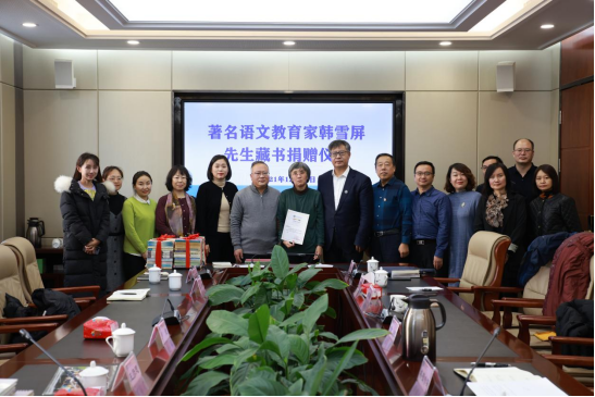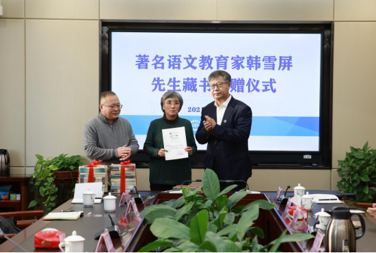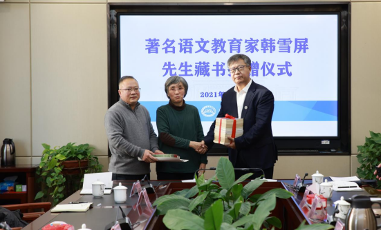 仪式上,韩雪屏先生的女儿将母亲生前的藏书、手稿、照片和师生交流的书信捐赠给学校。金桩校长代表学校接受捐赠并颁发了捐赠证书。文学院副院长李国德介绍了韩雪屏先生生平事迹。