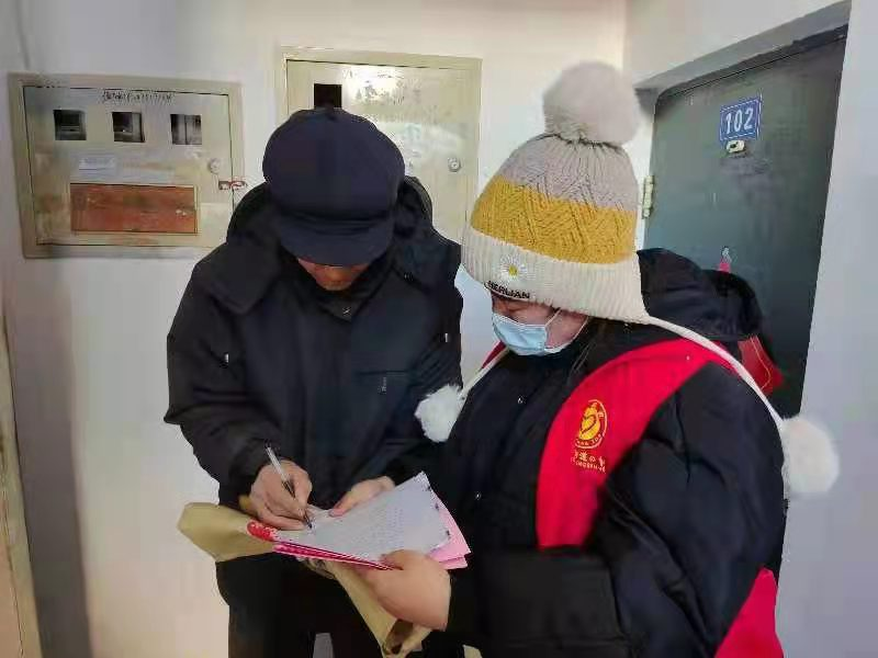 信息科学与技术学院2019级杜殊媚,在赤峰市阿鲁科尔沁旗天山镇志愿服务队,负责进行疫情防控政策宣传,入户进行外来人员排查登记。