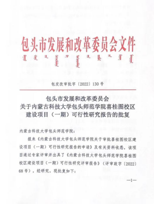 日前,包头市发展和改革委员会批复了我校喜桂图校区建设项目(一期)可行性研究报告,标志着我校在改善办学条件、扩大发展空间、加快建设综合性大学的道路上又迈出了坚实的一步。