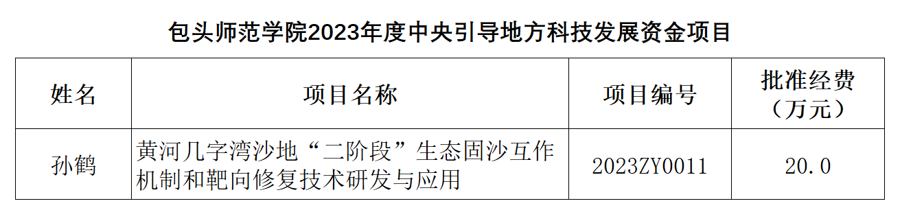 11月8日接到科技主管部门通知,我校获批1项中央引导地方科技发展资金项目,化学学院孙鹤老师的项目《黄河几字湾沙地“二阶段”生态固沙互作机制和靶向修复技术研发与应用》获批立项。