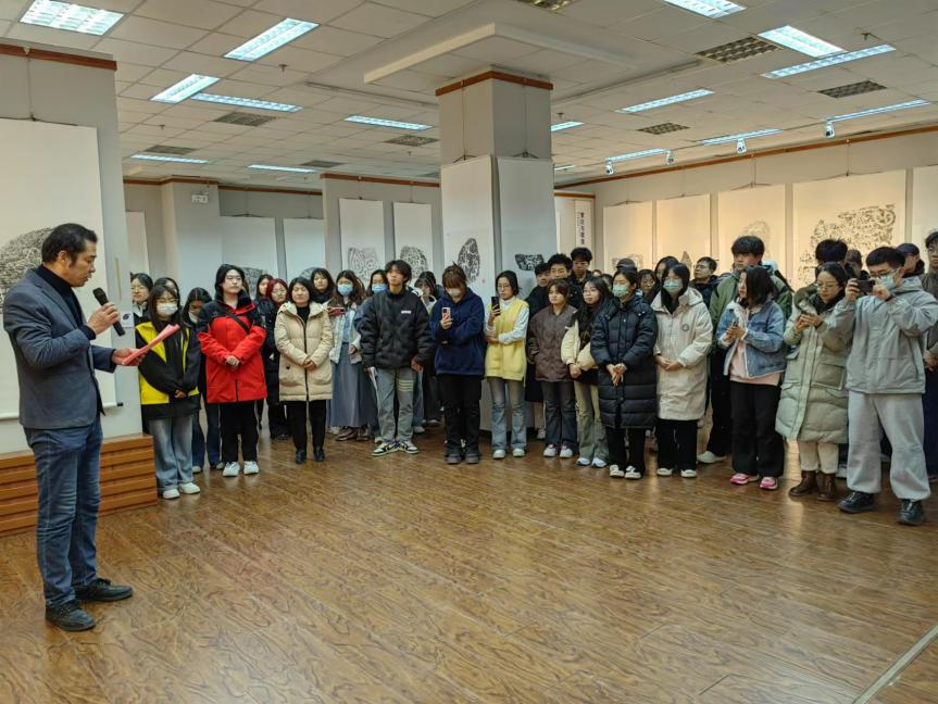 美术学院院长杨镇宇致开幕辞。本次展览观照内蒙古各民族交往交流交融的历史和现实,用史料和文物保护说话,展现了北疆文化深厚的历史底蕴和现实基础。品读岩画,拓展视野,对话远古,珍惜历史。阿拉善地处我国北疆,有着独特的地域及历史文化特色,岩画是当地人类先民留给后人的珍贵文化遗产,岩画拓片展对打造“北疆文化”品牌,铸牢中华民族共同体意识、建设中华民族现代文明、以中国式现代化全面推进中华民族伟大复兴具有重要的时代价值。此次艺术展的举办,依托我校作为自治区中华优秀传统文化传承基地和自治区非物质文化遗产研究基地的优势,表明我校为发扬优秀传统、弘扬北疆文化、推动学科建设、培育文化传承人方面所作之贡献,也为广大师生和岩画艺术爱好者提供学习交流之平台。