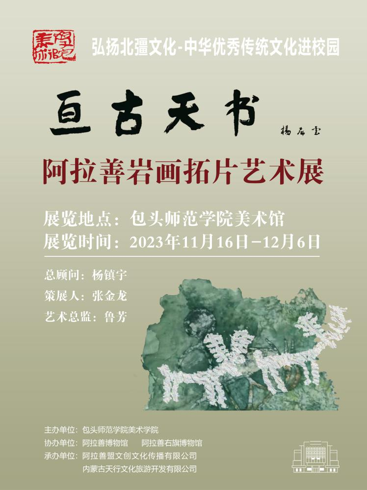 北疆文化是内蒙古大地上各种优秀文化的系统集成,是在各民族不断交往交流交融中形成的。打造好北疆文化品牌,对于我们贯彻落实习近平总书记对内蒙古的重要指示精神,办好两件大事,传承和弘扬好中华优秀传统文化,具有十分重要的意义。11月17日上午,由包头师范学院美术学院主办,阿拉善博物馆、阿拉善右旗博物馆协办,阿拉善盟文创文化传播有限公司、内蒙古天行文化旅游开发有限公司承办的“弘扬北疆文化—中华优秀传统文化进校园之阿拉善岩画拓片艺术展”在我校美术馆隆重开展。我校党委委员、副校长格根哈斯,党委委员、宣传部部长呼禾,教务处处长赵建军,学生工作部部长薛志东和美术学院领导班子成员、师生代表参加了此项活动。阿拉善盟文物保护研究中心主任景学义,阿拉善盟美协副主席、盟九三学社书画院副院长宝祥,阿拉善盟文创文化传播有限公司经理张金龙应邀参加了展览开幕式,美术学院党总支书记史继敏主持。