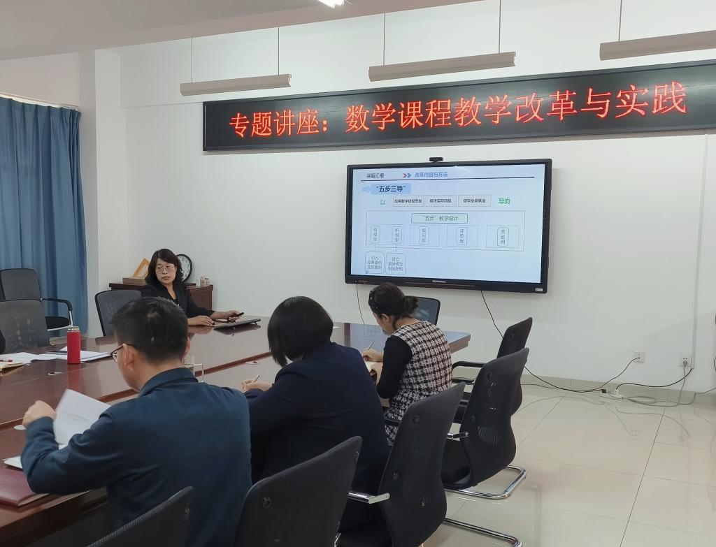 系列成果汇报展示第四期,开展以“数学课程教学改革与实践”为主题的专题讲座,由我校数学科学学院副教授辛小青和副教授李姝敏两位老师进行经验分享。辛小青老师以学生中心视域下《高等数学》课程思政的教学设计研究为主题,从《高等数学》课程思政教学目标的设置、教学内容的设计和教学方法的实施等三个方面深刻阐明了思想政治教育如何融入教学过程,最后提出了课题研究中存在的问题和不足,以及后续研究的目标任务。李姝敏老师围绕课题的研究背景与意义、研究内容与方法及存在的问题等方面展开具体介绍,并以常微分方程中的降阶法、线性代数中的矩阵乘法和数学分析中的微分中值定理为例,详细阐述了“五步三导”教学设计的思路、实施过程和课程思政融入的方法。