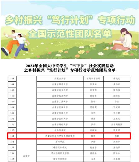2022年,我校被评为全国暑期“三下乡”社会实践优秀单位;我校志愿服务工作获自治区“优秀组织单位”荣誉称号,校团委书记在自治区实践育人表彰大会上作典型发言。2023年,我校1支重点服务团队获评“三下乡”社会实践活动之乡村振兴“笃行计划”专项行动全国示范队。