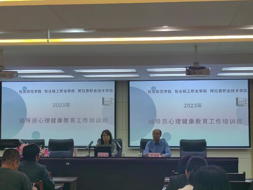 本次培训是学校辐射引领另外两所高校项目之一,是根据去年以来我们到各单位调研走访,普遍反映辅导员心理健康知识储备不足,做好学生心理健康教育服务方法不多,面对形形色色的学生心理状况,无从下手的情况精心设计的。本次培训共分为三讲,第一讲主题是:走近心理健康——辅导员心理健康维护,主要内容是:认识心理健康,对心理健康水平进行初步识别与判断,掌握维护自身心理健康的一般理念和方法,由包头师范学院教育科学学院心理学专业副教授、国家二级心理咨询师吴晓艳老师主讲;第二讲主题是:心理健康做什么——学校心理健康教育实务,主要内容是:辅导员在一线工作中如何理解心理健康教育,以及需要掌握的心理健康教育内容与方法,由包头师范学院心理咨询中心研究员、国家二级心理咨询师郭仰东老师主讲;第三讲主题是:学生心理怎么了?——大学生心理健康状况分析。我校和包头轻工职业技术学院选派辅导员、班主任现场参加培训,阿拉善职业技术学院通过收看线上直播的方式在阿拉善左旗和乌斯太校区分别参加培训。