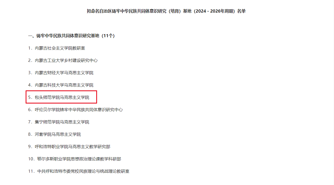 为深化铸牢中华民族共同体意识理论研究,推动自治区铸牢中华民族共同体意识研究基地扩容、提质、增效,根据《内蒙古自治区铸牢中华民族共同体意识研究基地管理办法》,经各有关高校、社会主义学院、盟市委党校(培训学院)推荐申报,经基地办公室材料审核、四部门实地考察、组织专家评审等考评流程,拟命名11家单位为铸牢中华民族共同体意识研究基地,我校成功入选。