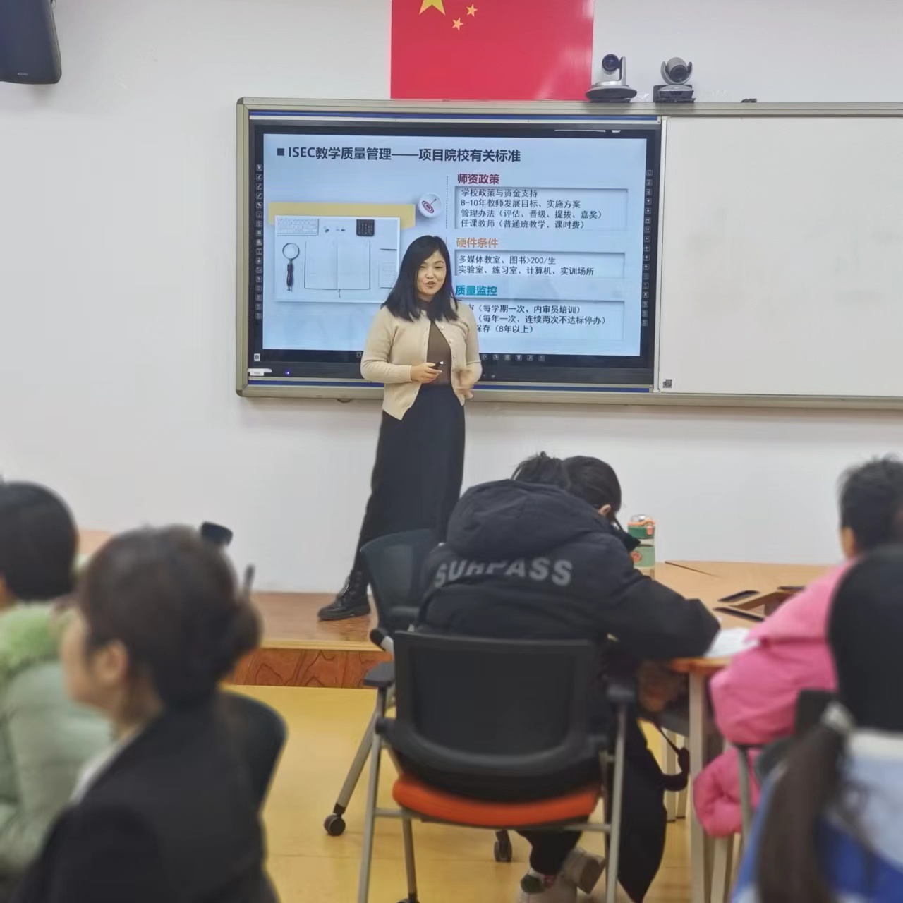 培训就ISEC项目介绍、学校支持政策、项目在我校的办学情况、ISEC课程特点、基于学习成果的教学大纲设计、以学生为中心的学习评价、明辨性思维、ISEC教学保障—内审介绍、EMI教学等方面,邀请学校教学经验丰富的ISEC项目培训师进行了详细培训。