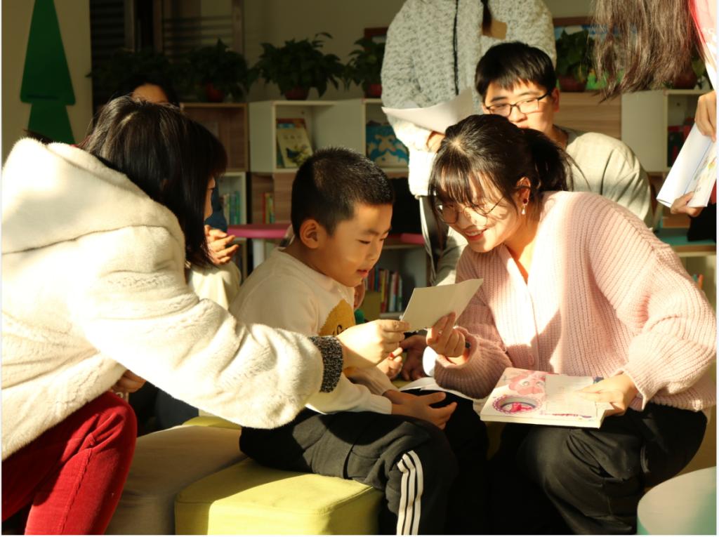 活动现场布置得温馨而有趣,展示了大量精选的绘本作品。此次绘本剧表演由我校热爱绘本的大学生志愿者负责策划和表演,绘本剧表演是整个活动的亮点之一。大学生志愿者们通过精心编排和扮演小兔子、老狼以及其他动物角色,将“老狼老狼几点了”的故事情节生动地呈现在大家面前。他们用诙谐幽默的动作和表情,配合音效和音乐,使整个表演更加生动有趣。为孩子们带来一场精彩的视觉盛宴。小朋友们沉浸在故事情节中,被表演者们的精彩演出所吸引,他们笑声不断,享受着这个独特的阅读体验。