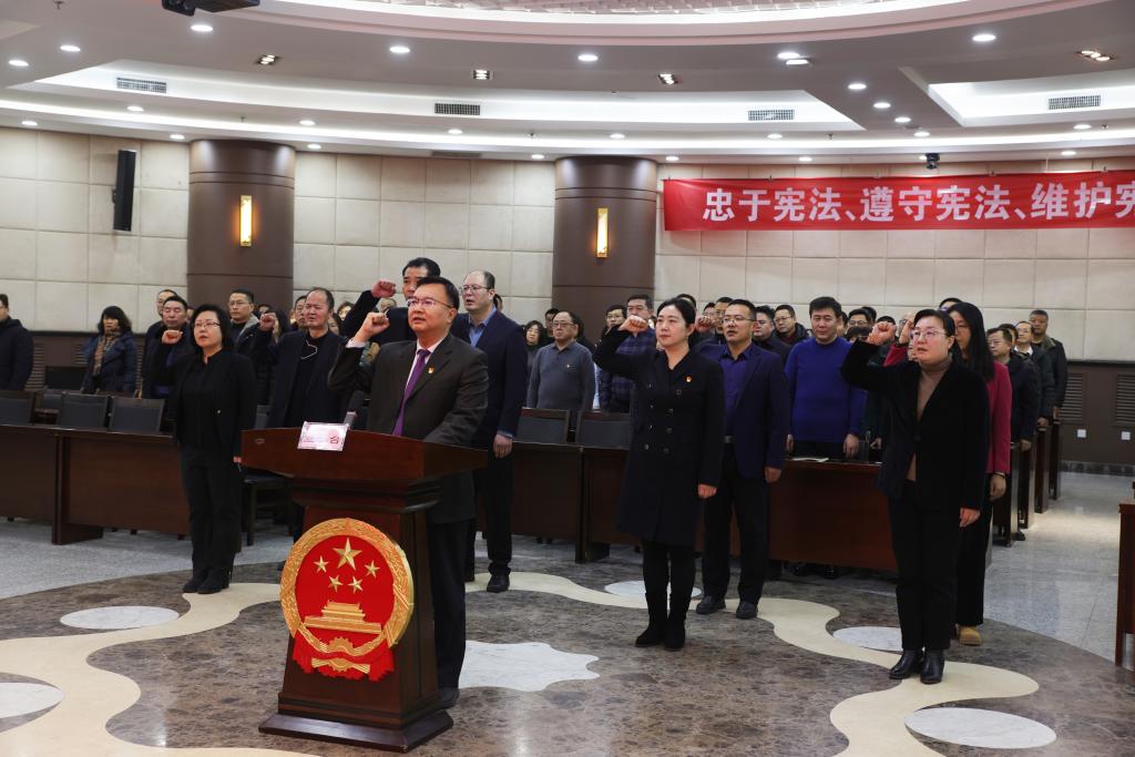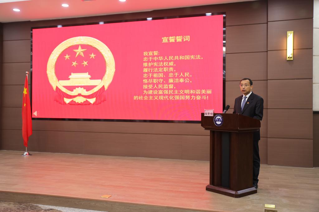 1月2日下午,我校举行宪法宣誓仪式。校党委书记黄海监誓并讲话。2023年新任职干部,郭金虎校长、杨海燕副校长及部分处级干部代表庄严宣誓。校党委副书记施纪华主持仪式。