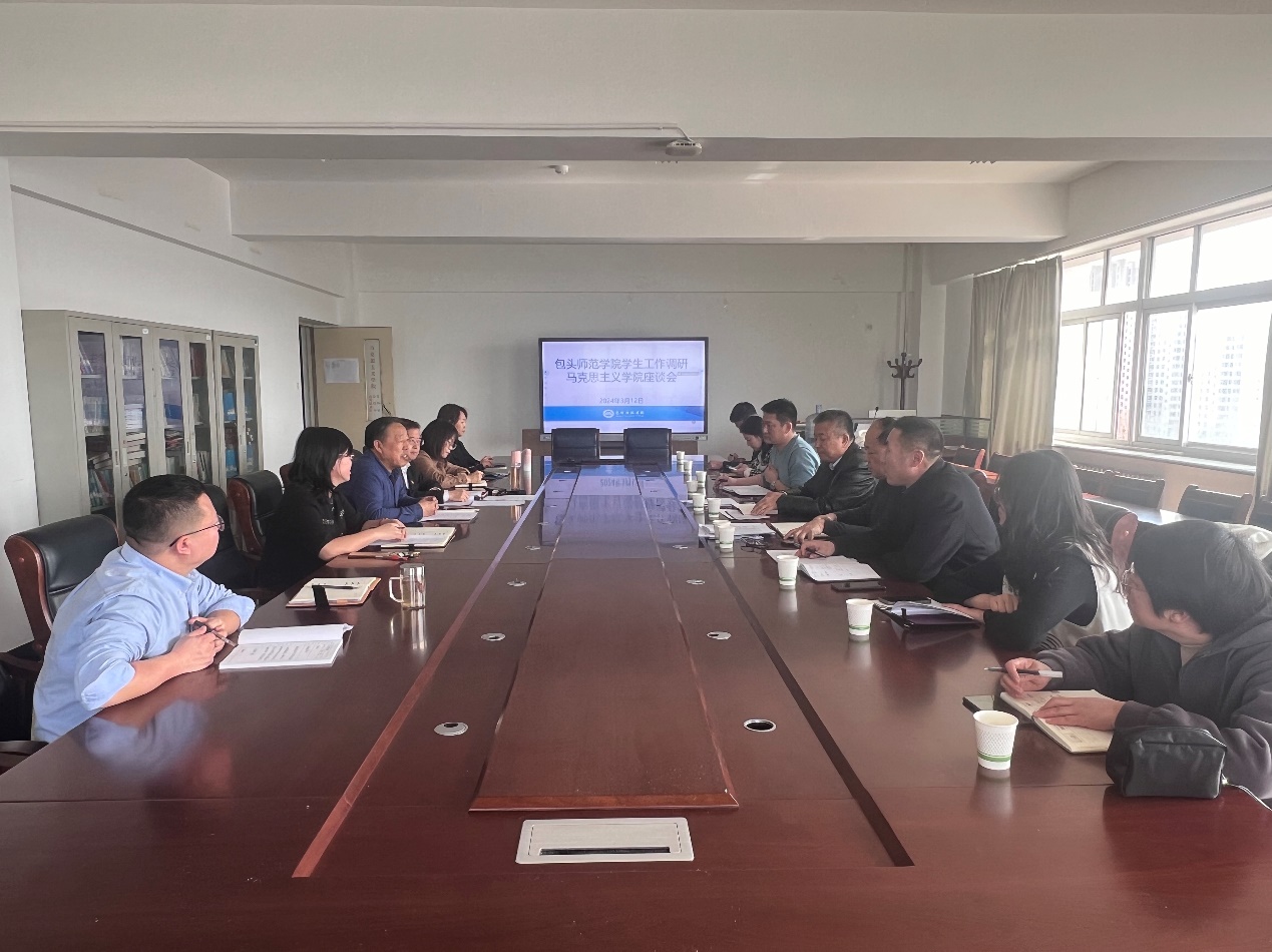 党总支副书记郭宏升对学院工作力量、党团组织、铸牢中华民族共同体意识研究中心、接诉即办、学业指导、就业指导等“十进”“一站式”学生社区推进情况、重点关注学生工作、学生教育管理工作、学生资助工作、学生公寓管理工作及存在的问题进行了汇报。在听取汇报后,李建军围绕调研中心问题与马克思主义学院进行深入交流,针对学院提出的意见和建议做了反馈。