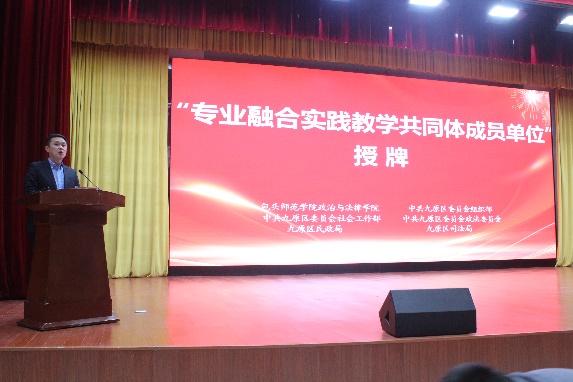 会议第二项议程,包头师范学院政治与法律学院为中共九原区委组织部、社会工作部、政法委、九原区民政局、司法局授“专业融合实践教学共同体成员单位”牌匾。包头师范学院政治与法律学院与九原区委区政府各部门推进的政校合作,是在政治与法律学院“法学、社会工作、政治与行政学”专业融合发展基础上推进的。专业融合实践教学共同体的建立是政治与法律学院深入贯彻落实新时代高等教育改革发展的重要举措。这一举措将为我校政治与法律学院的教师提供学以致用、施展才干、服务地方经济社会发展的平台;将为政治与法律学院三个专业的679名学生提供参与法律援助、法律宣传、社区治理、社会调查、政策研究、行政管理等实践活动的优质通道,为学生了解法律实务、提升社会工作能力,增强政治素养和行政能力带来可行路径。