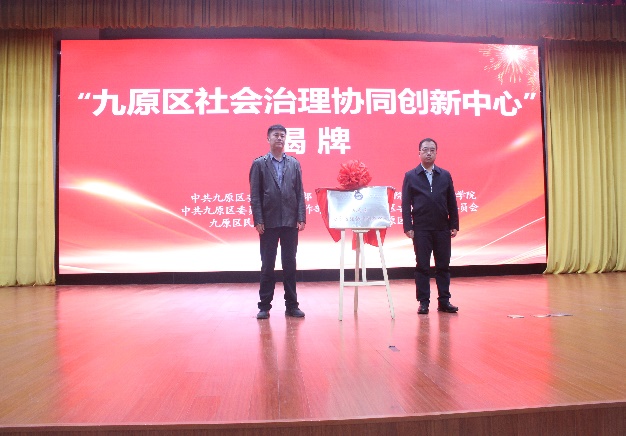 会议第一项议程,九原区委副书记、政法委书记米利新和包头师范学院政治与法律学院院长高德胜共同为“九原区社会治理协同创新中心”揭牌。落地包头师范学院政治与法律学院的“九原区社会治理协同创新中心”将成为地方高校发挥专业优势助力九原区社会治理工作的沃土。