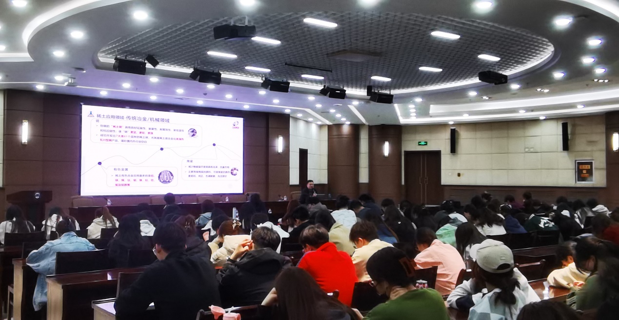 居立东工程师从稀土的概念、种类、分布以及在永磁材料、储氢材料、催化材料、发光材料等新领域中的应用和稀土产业绿色发展等方面做了形象生动地讲解,阐述了稀土在工业和高科技领域、环保、医疗和农业等方面的广泛应用以及对我们工作生活有着息息相关,并与师生进行了交流互动。
