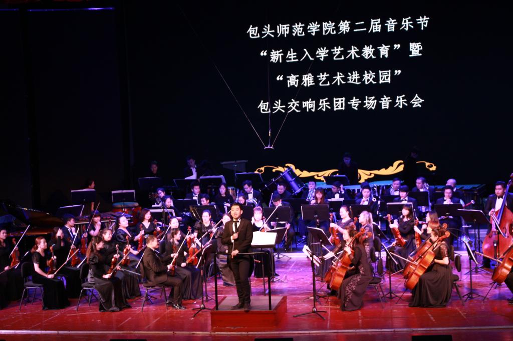 12月11日晚,我校“新生入学艺术教育”暨“高雅艺术进校园”包头交响乐团专场音乐会在会堂举行。校党委委员、副院长施纪华,学生工作部部长尚海涛、团委书记呼禾、保卫处处长盖永涛、包头交响乐团团长梁源及音乐学院领导班子全体成员出席活动,各学院2017级新生代表900余人欣赏了音乐会。活动由我校与包头市民族歌舞剧院联合举办。
