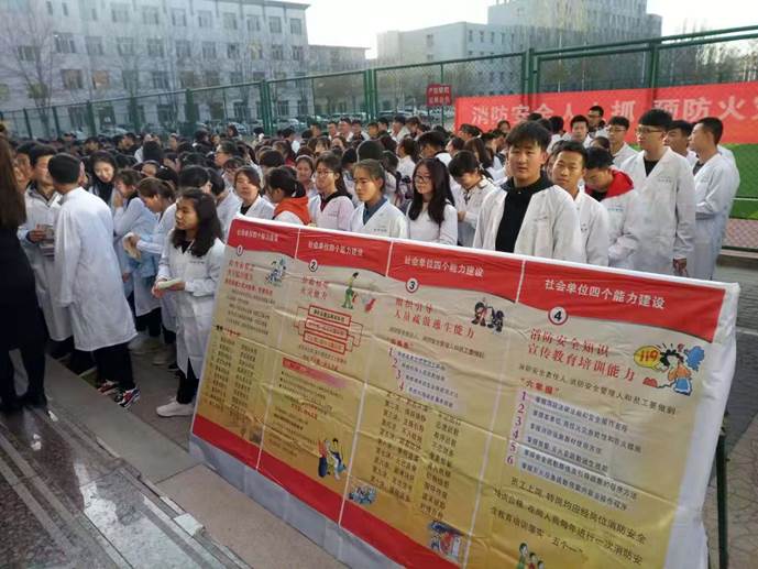 下午16点30分,演练开始,实景模拟生化实验楼多处起火,楼道内烟雾弥漫,消防应急预案立即启动,警报声随之响起,指挥员下达疏散命令后,各实验室参演师生,在工作人员的引导指挥下,用湿手帕、湿毛巾等捂住口鼻,弯腰沿着疏散通道迅速有序疏散。随后在生化楼前集合,清点人数,保卫处消防科科长就疏散情况进行通报,就疏散中存在的问题,进行点评,并强调一旦真实火情发生,必须严格按照疏散要领迅速疏散。