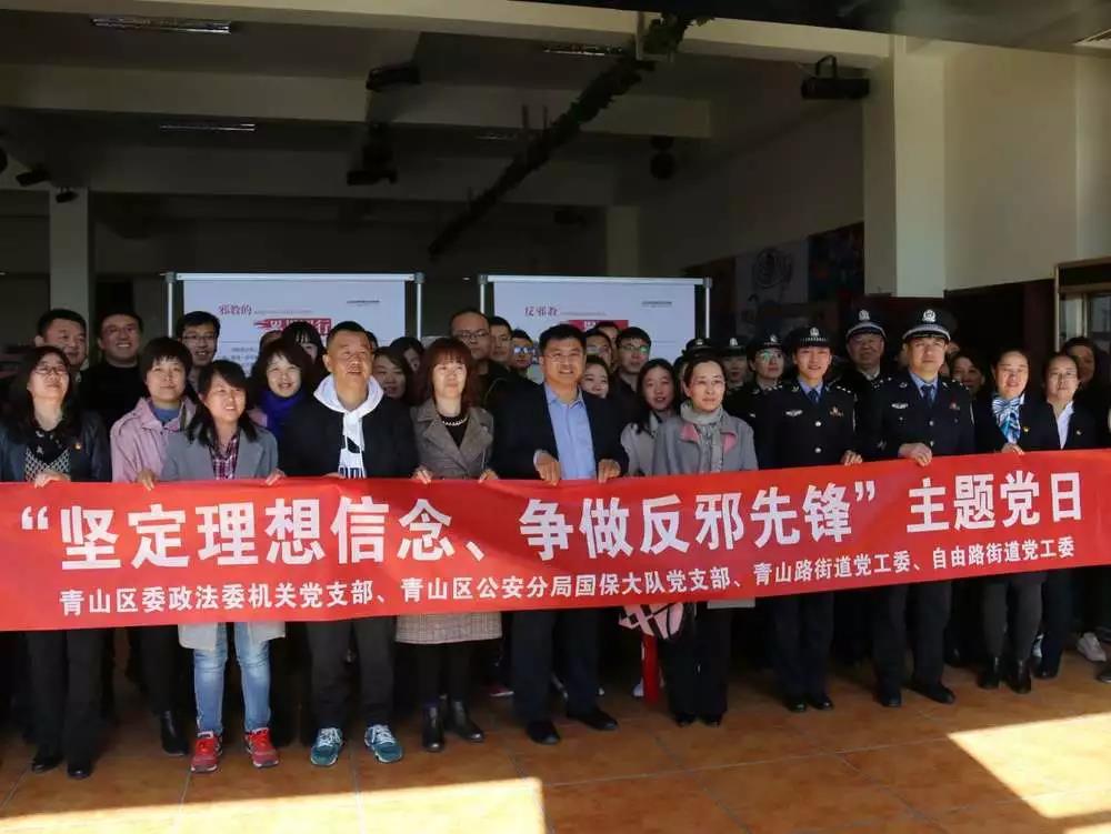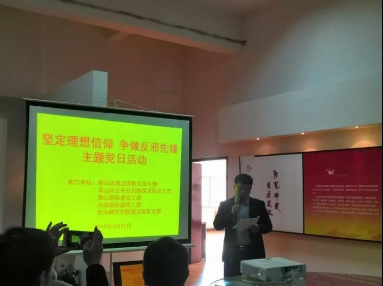 3月21日上午,青山区委政法委机关党支部、青山区公安分局国保大队党支部、青山路街道党工委、自由路街道党工委、包头师范学院保卫处党支部五家区域党组织共融共建,在包头师范学院暨青山区反邪教警示教育基地,开展“坚定理想信念 争做反邪教先锋”主题党日活动,共60余名党员参加了活动。