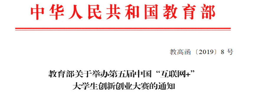 为深入贯彻落实全国教育大会精神,全面落实习近平总书记给中国“互联网+”大学生创新创业大赛“青年红色筑梦之旅”大学生的重要回信精神,按照《国务院办公厅关于深化高等学校创新创业教育改革的实施意见》等文件要求,加快培养创新创业人才,持续激发大学生创新创业热情,展示创新创业教育成果,搭建大学生创新创业项目与社会资源对接平台,定于2019 年3月至10月举办第五届中国“互联网+”大学生创新创业大赛。现将有关事项通知如下。