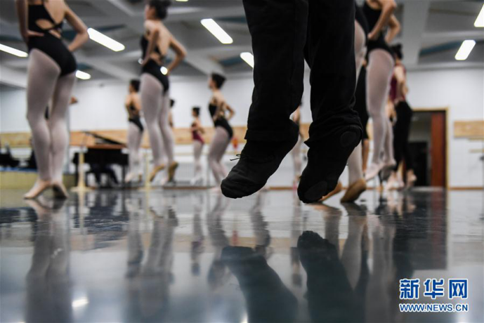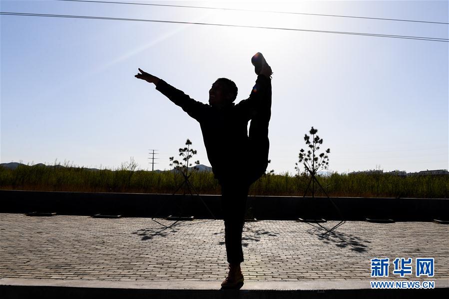 4月26日,在包头师范学院,刘子青和同学们一起练习舞蹈动作。