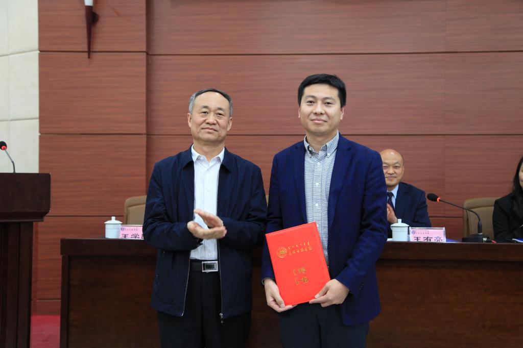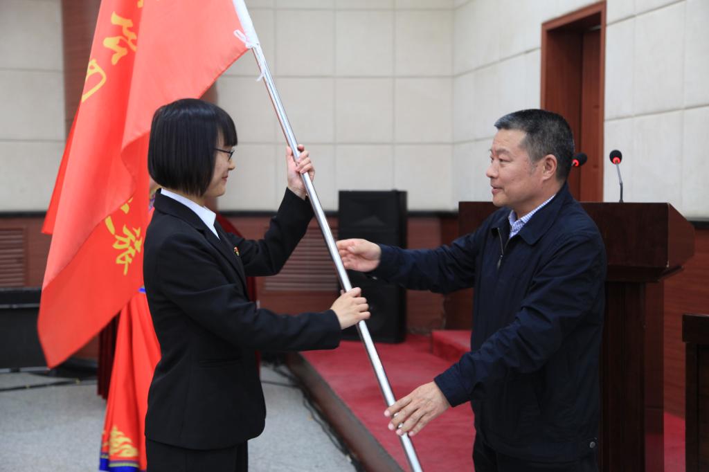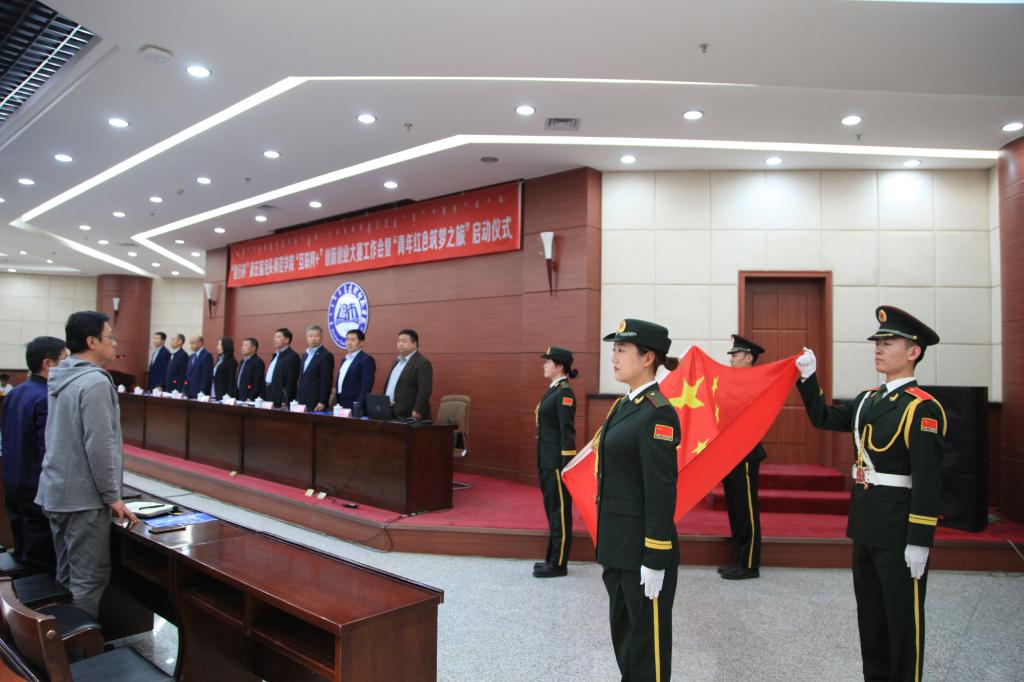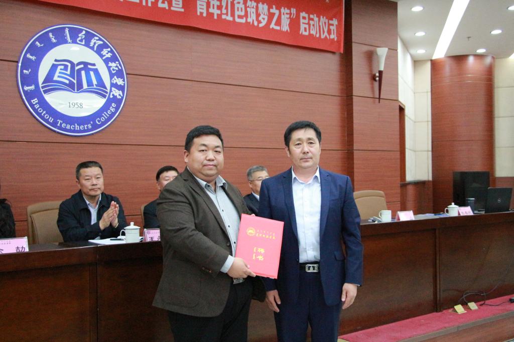 校党委书记王永明为“青年红色筑梦之旅”活动授旗,物理科学与技术学院学生党支部第一党支部书记张锐领旗并作了表态发言。校领导双山、杨春生为“互联网+”大赛指导教师颁发聘书。