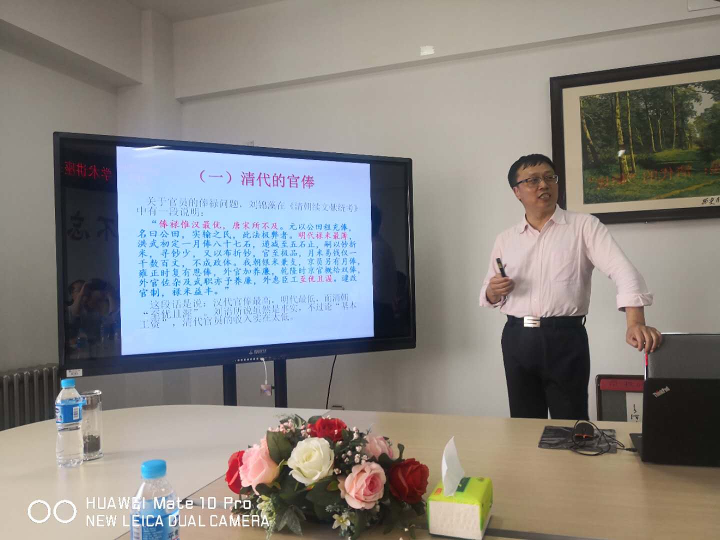 为了打造中国史一级硕士学科点的学术品牌,进一步提升学科竞争力,5月16日下午,应历史文化学院邀请,中央财经大学博士、教授郝秉键来我校做了题为“清代的陋规”的学术报告。报告会由历史文化学院院长胡琮禹主持。历史学专业的全体教师、硕士研究生及部分本科生聆听了报告。