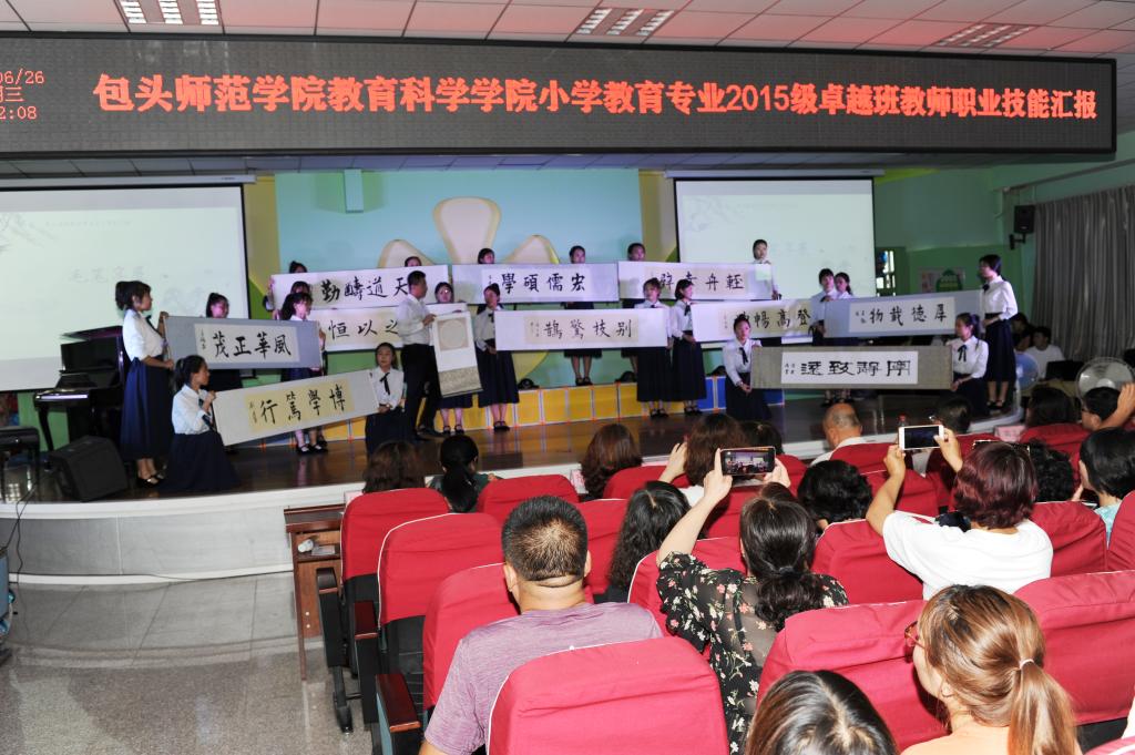 为了适应师范专业认证理念和要求,凸显合作育人、成果导向和特色发展的思路,本次汇报在2014卓越班汇报的基础上有了新的调整和改进:一是汇报场地直接选择实践基地学校,将学生训练成果直接在用人单位进行展示;二是汇报项目加入了师生合作项目,来自实践基地校的指导教师与学生同台展示了教师基本职业技能;三是学生作品系列化,如微课制作分别按照汉字文化和中国传统节日两个系列来完成,共形成了两个系列12个微课作品,再如绘本制作也形成了“蒙古族民间儿童绘本系列”,共4部作品;四是打造精品成果化,书法作品全部装裱收藏,绘本全部印制成册留存。 (教育科学学院)