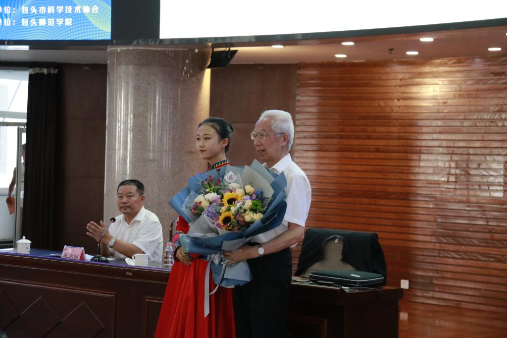 报告会前,我校学生代表向龙乐豪院士敬献鲜花,表达了我校全体师生对航天专家的崇高敬意。