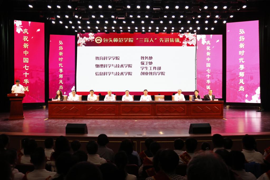 校党委委员、副院长施纪华宣读了《中共包头师范学院委员会、包头师范学院关于表彰2017-2018年度校级“三育人”先进工作者、先进集体的决定》和我校2018-2019学年度荣获自治区、包头市优秀个人和先进集体名单。这些先进个人和先进集体都是近年来在学校各个岗位上涌现出来的优秀代表,他们积极践行党的教育方针,立足本职岗位,全心全意服务师生,为促进学校事业发展做出了积极贡献。