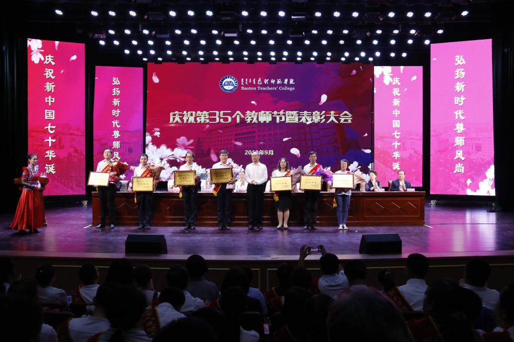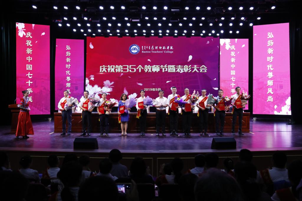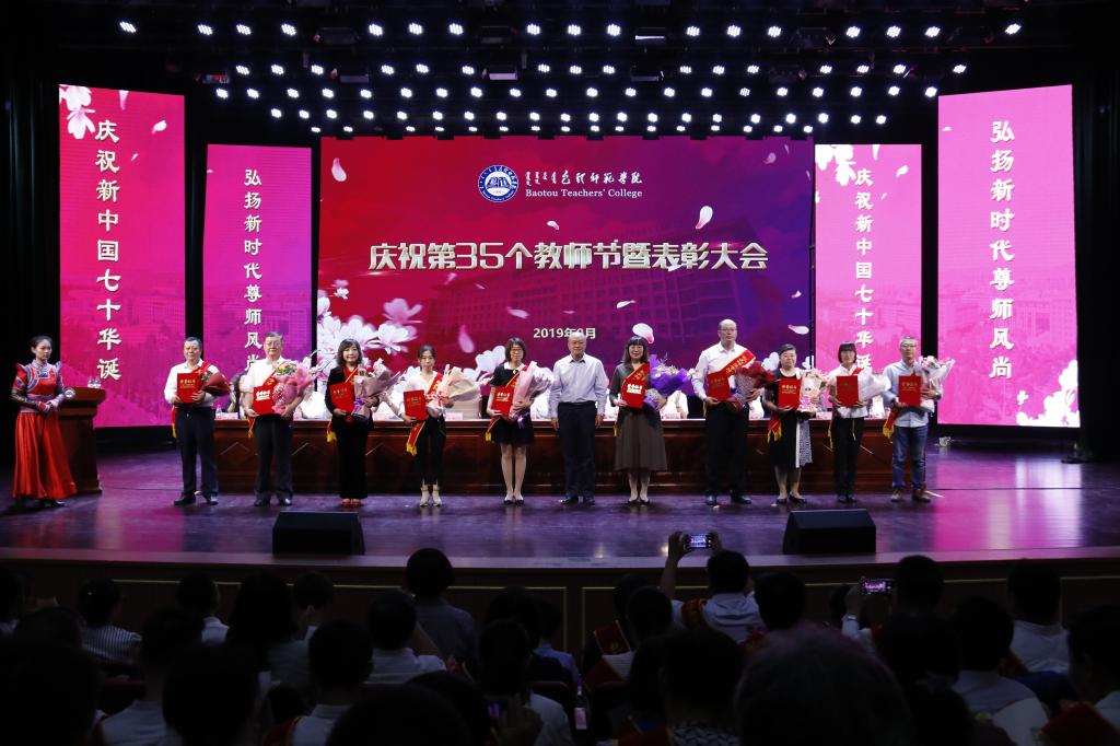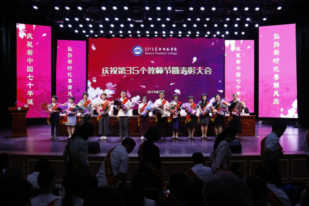 学生代表分别为荣获“自治区高等学校教学名师、教坛新秀、优秀共产党员、优秀党务工作者、先进基层党组织”称号的教师和集体代表,荣获“包头市优秀教师、优秀教育工作者、优秀班主任、‘德教双优’教师、优秀共产党员、优秀党务工作者、先进基层党组织”称号的教师和集体代表敬献鲜花。