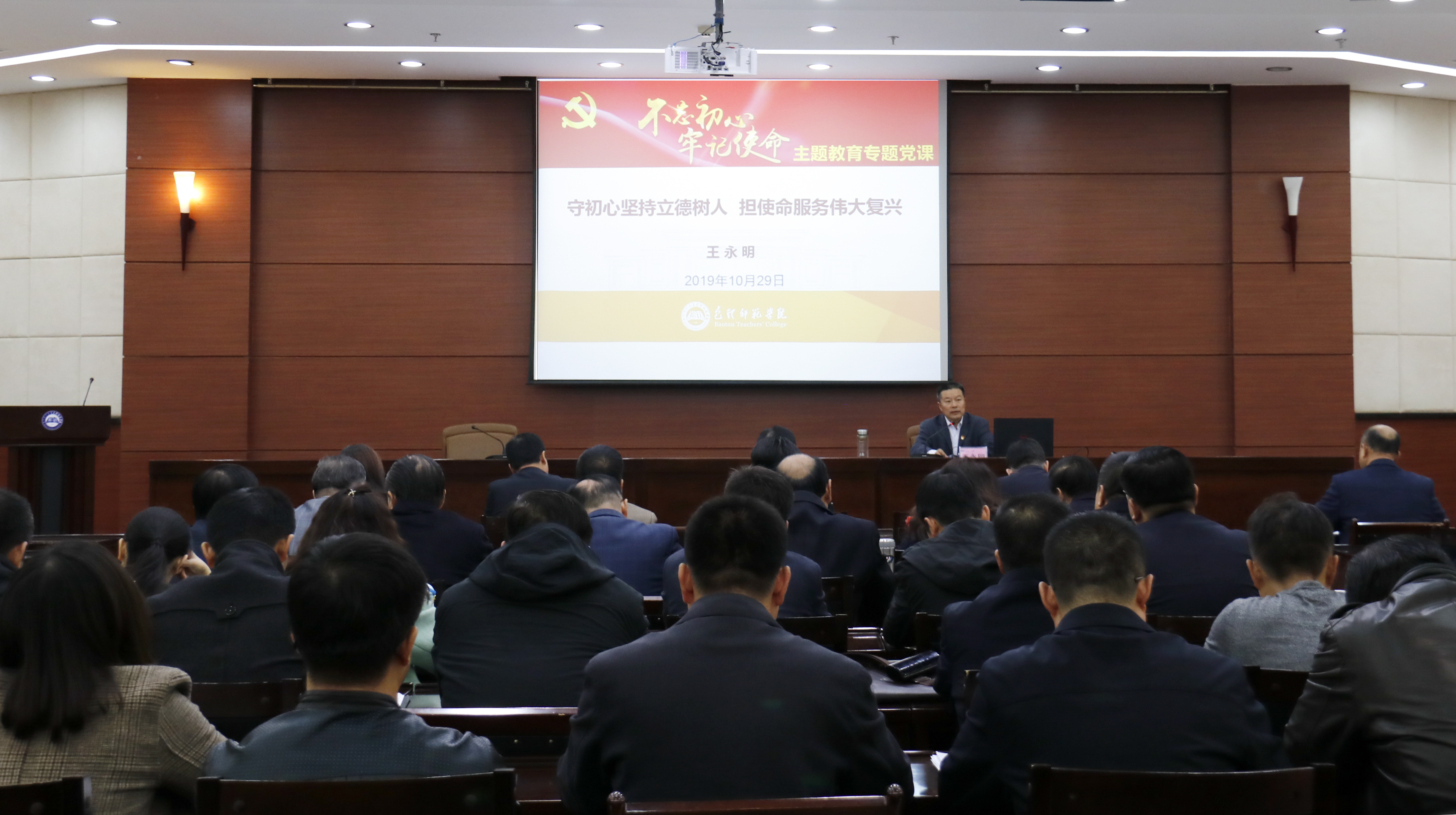 10月29日下午,校党委书记王永明在图书馆会议厅作了题为《守初心坚持立德树人 担使命服务伟大复兴》的主题教育专题党课。内蒙古自治区党委第二巡回指导组成员孟国珍、包双成到会指导。学校全体副处级以上领导干部聆听党课。