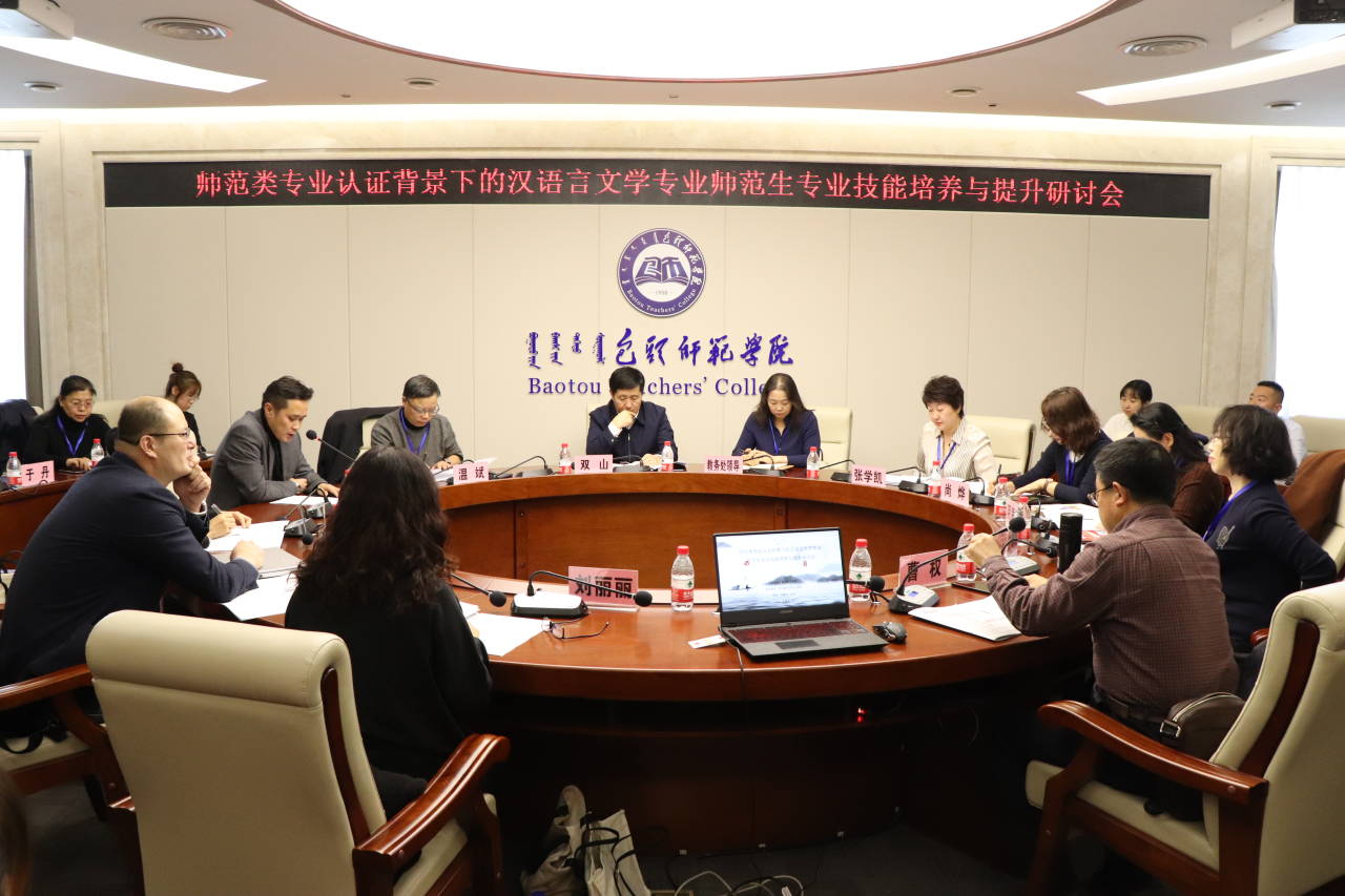 包头市第三十三中学特级教师曹权、青山区教育局语文教研室主任、高级教师王云峰、包头市教育局高级教师郭伟以及包钢第二小学书记、高级教师阴海燕、我校文学院汉语言文学专业系主任李国德、教师刘丽丽,分别围绕“汉语言文学专业师范生技能考核实施过程及改进举措”、“师范类专业认证背景下汉语言文学专业师范生教学技能培养体系的现状与展望”“汉语言文学专业毕业生中小学从教状态与反思”“汉语言文学专业师范生语文学科核心素养的养成与提升”等议题进行了主题发言。期间,与会教师就“汉语言文学专业教育如何更好地服务于语文教学”进行了热烈的讨论,一致认为应将汉语言文学专业内在核心素养的培养和语文教育实践能力的提高有机融合、高度统一,形成相互支撑、互为一体,不断深化的良性格局。