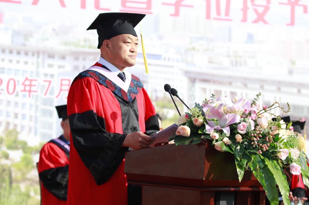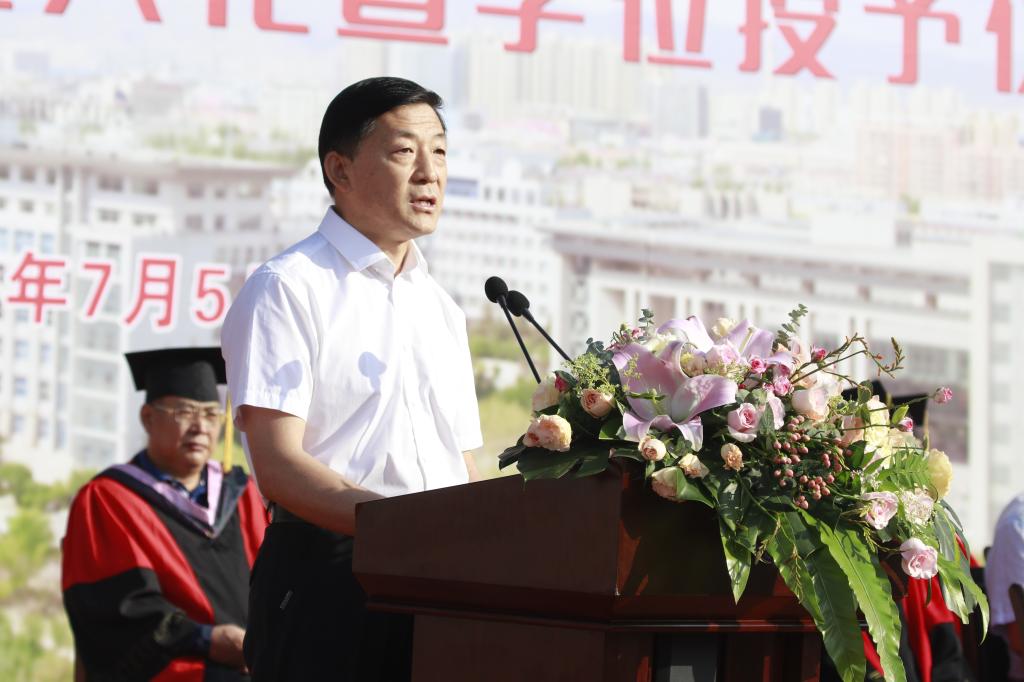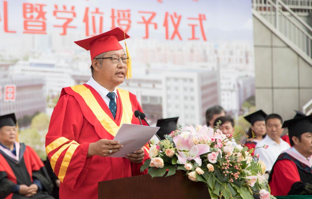 院长金桩教授发表毕业致辞。他代表学校向毕业生表示最热烈的祝贺和最美好的祝福,回顾了本届毕业生与包师共度的四年光阴故事,对毕业生寄予四点期望:一要树立家国情怀,牢记习近平总书记的嘱托,坚定理想信念、站稳人民立场,投身强国伟业,在实现中华民族伟大复兴中国梦的新长征路上,只争朝夕,不负韶华,放飞青春的梦想,续写华彩人生;二要永葆奋斗姿态,把每一个平凡的岗位,都当成干事创业的舞台,要始终保持自力更生、艰苦奋斗的姿态,踏实作为,努力成为实现中华民族伟大复兴的追梦人、圆梦人、见证者、参与者、推动者和创造者;三要弘扬创新精神,能够把创新思维当成一种习惯和本能,善于发现机会、把握机会,用创新思维去发现新世界,敏于求知,努力探索未知世界,积极应对数字化、智能化发展新时代;四要常怀感恩之心,用涵养丰富的思想和情感,体察人间的冷暖,关心个体的命运,感受豪情和力量,理解爱与幸福,感恩时代、感恩国家、感恩母校、感恩父母、感恩自己和守护自己的人们。