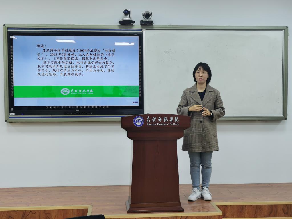 10月15日下午,由教务处主办,外国语学院承办的教学沙龙活动在博学楼东106教室举行。本次教学沙龙主题为“对分课堂理念下线上线下混合式教学模式探索”,主讲人为外国语学院张晓敏老师。各学院校级一流课程负责人、参与人,各学院相关教师及2019年新入职教师参加本次活动。