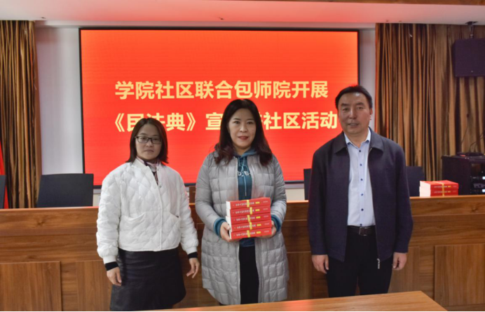 9月24日上午,我校宣传部、政法学院在学院社区举行了普法宣传《民法典》进社区活动。学校党委宣传部向学院社区进行了《民法典》等书籍捐书活动,政法学院秦嗣权博士为社区居民介绍了《民法典》产生的历史背景、历史沿革及此部《民法典》的亮点,并就居民所关心的法律问题与社区居民进行了深入的交流。通过活动,加深了社区居民对民法典的了解。
