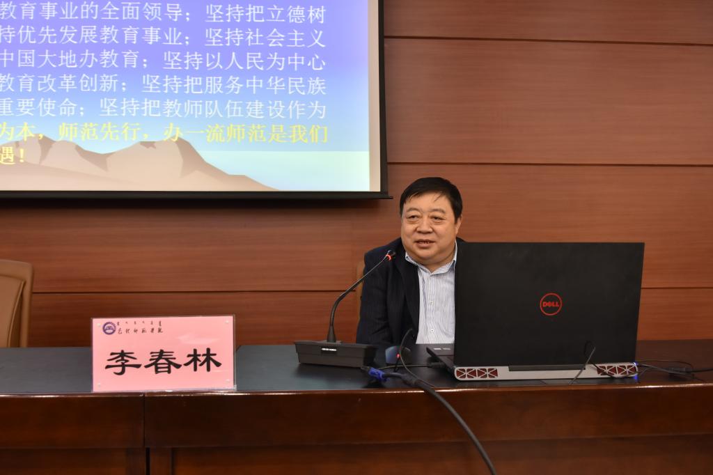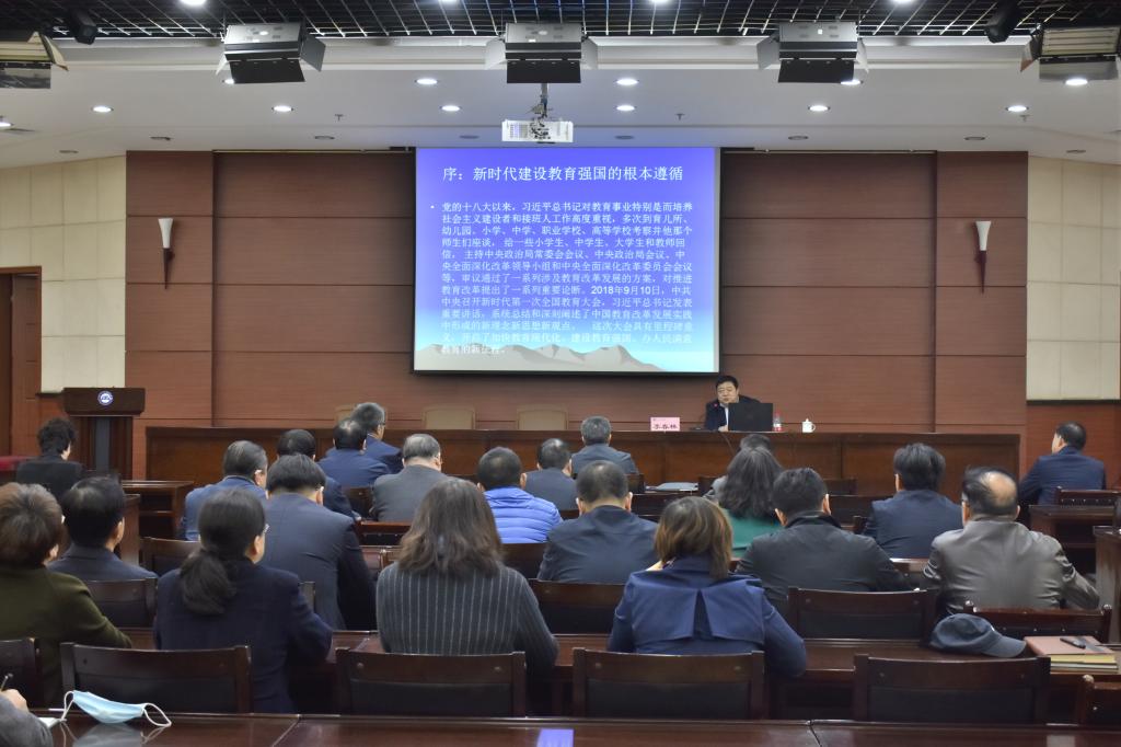 10月21日下午,我校在图书馆会议厅组织校院两级中心组集体学习,特邀内蒙古社会科学院院长李春林研究员以“学习贯彻习近平总书记教育重要论述,办人民满意的社会主义一流大学”为主题,为广大干部师生做了《习近平总书记教育重要论述讲义》专题学习辅导讲座。校领导,副处级以上干部参加了学习。