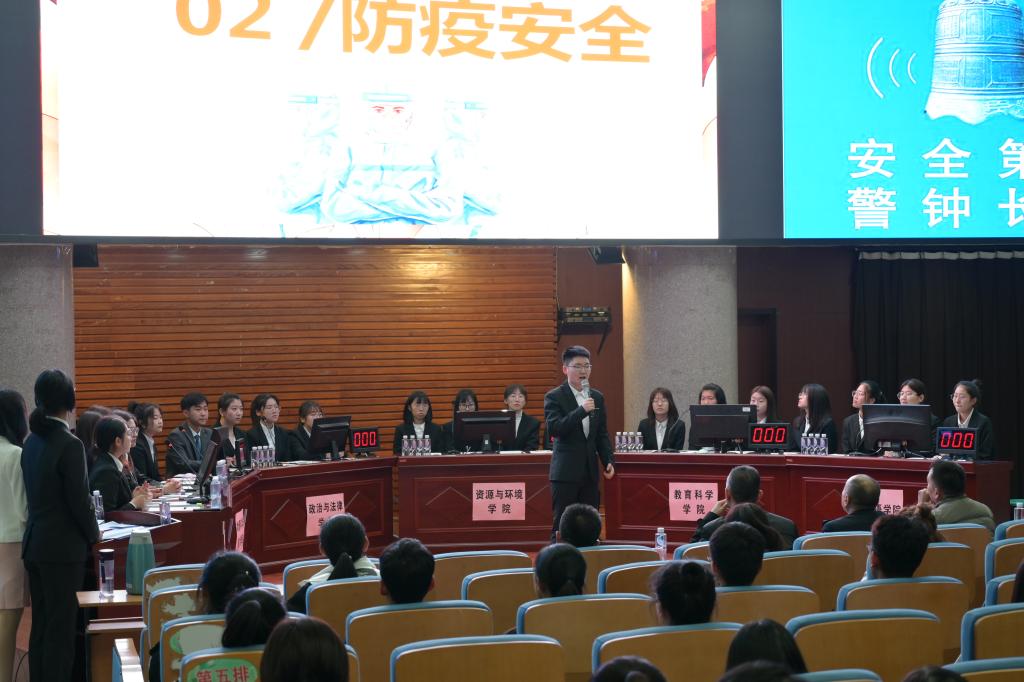 本次大学生安全知识竞赛十六个学院均选派了参赛队。通过预赛,政治与法律学院、经济与管理学院、资源与环境学院、外国语学院、物理科学与技术学院、教育科学学院晋级了决赛。决赛分为“安全知识我来讲”和“安全知识我知道”两个阶段,内容涉及新冠疫情防控、预防鼠疫、防范邪教、防范传销、毒品预防和交通、宿舍用电、消防、财产、人身、饮食安全等方面的常识。比赛现场紧张激烈,比赛进程井然有序,经过内容丰富、富有感染力且不失教育意义的安全演讲环节,激烈的抢答题、必答题、风险题环节后,加上网络投票得分,最终政治与法律学院获得竞赛一等奖,资源与环境学院、经济与管理学院获得竞赛二等奖,物理科学与技术学院、外国语学院、教育科学学院获得竞赛三等奖。