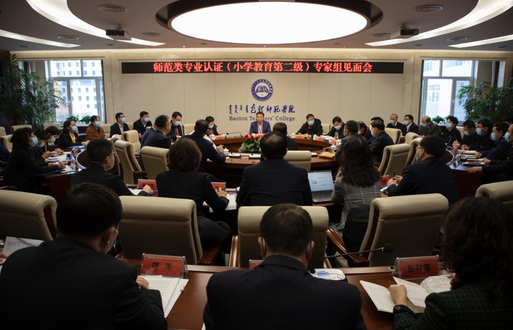 11月30日上午,教育部师范类专业认证专家组见面会在行政楼四楼第二学术报告厅举行。李中国组长主持见面会。包头市人民政府副市长、党组成员武二斌同志出席会议,自治区教育厅教师工作处副处长李刚出席会议并致辞。