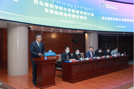 金桩院长代表学校作了表态发言。他表示,专家组提出的意见和建议,全面客观、切中要害,既充分肯定了我校小学教育专业建设取得的成绩,又帮助我校小学教育专业乃至所有师范专业找准了短板弱项,指出了根源症结,明确了改进方向,学校高度重视,完全赞同,诚恳接受,照单全收。他强调:全校上下要统一思想,深化认识,在整改提高上聚焦发力;要巩固成果,持续改进,在内涵建设上聚焦发力;要深化改革,推进认证,在教师教育上聚焦发力。我们要坚持把“教师教育改革”和“师范专业认证”作为驱动教师教育发展的两个协同滚动的重要轮子,以高质量发展为主题,以深化教师教育改革为引擎,以推进师范类专业认证工作为抓手,围绕“谁来培养人”和“谁来培养培养人的人”两个重大问题,不断深化教师教育改革,提升教育教学水平,开启我校教师教育发展的新征程,努力形成具有包师特色的教师教育体系,将学校建设成为教师教育特色鲜明的高水平师范院校,促进我校教师教育优质资源更好地为民族地区的教育改革服务。