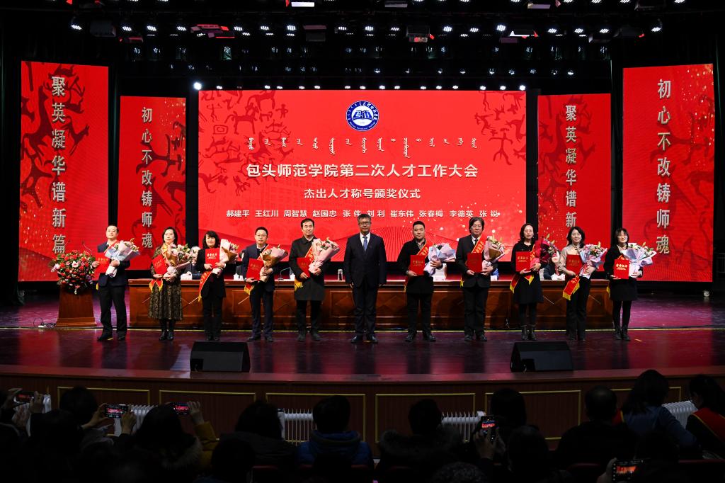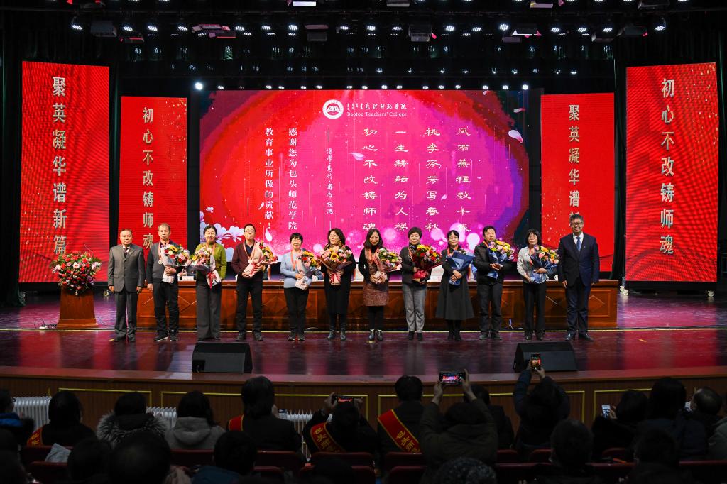 大会举行了2020年退休教师荣休仪式,感谢我校退休教师为包头师范学院教育事业做出的贡献。退休的教职工代表上台接受了全校教职工的崇高敬意,新入职的青年教师代表为荣休教师献上表达敬意的鲜花,校党委书记王永明、校长金桩为退休教师颁发荣休纪念章,全场教师热烈鼓掌对所有为包师发展做出贡献的离退休教师表达祝福!