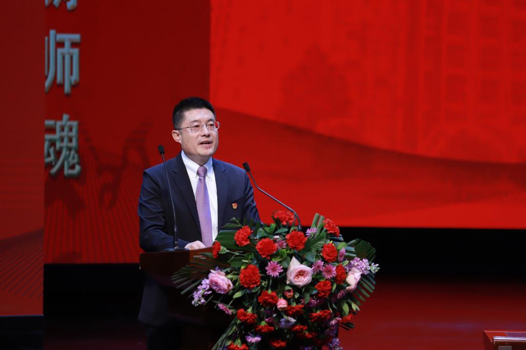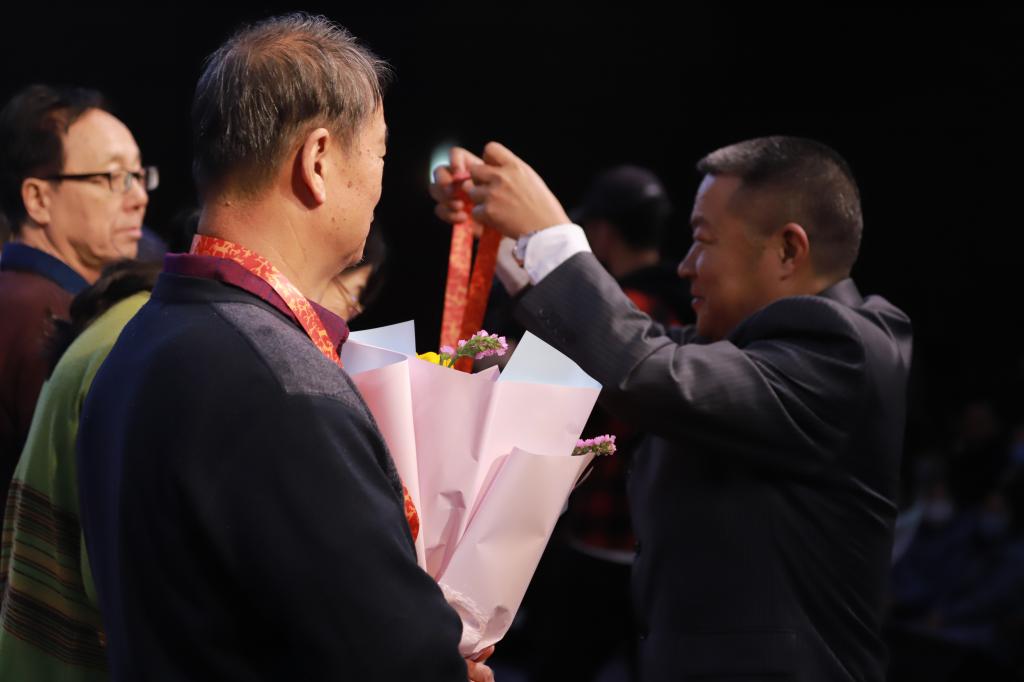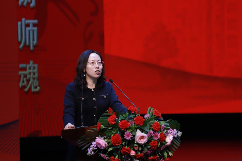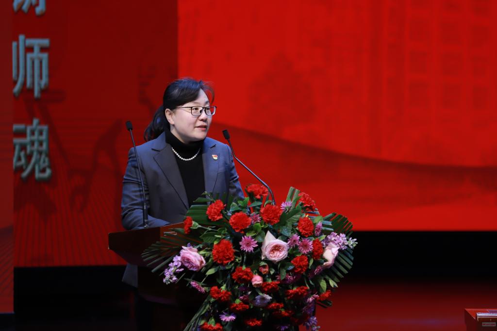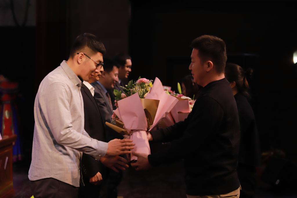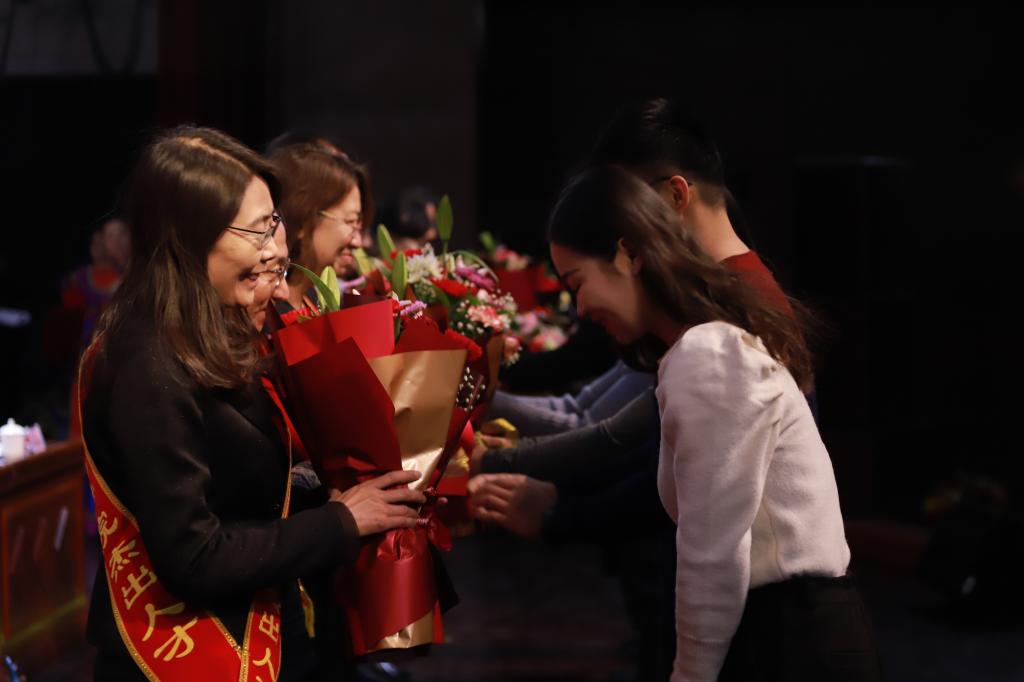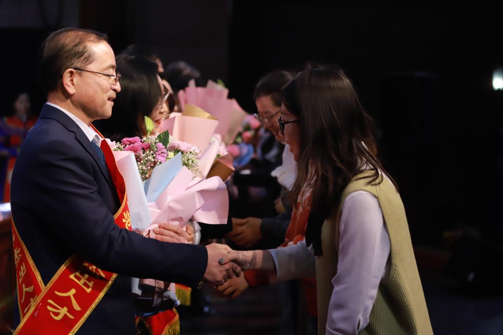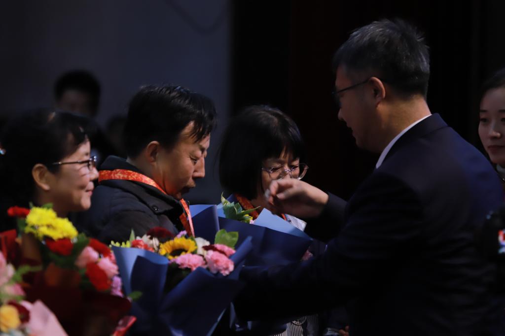 新入职教师代表为人才工作先进单位代表、优秀团队代表和获得杰出称号的个人敬献鲜花。