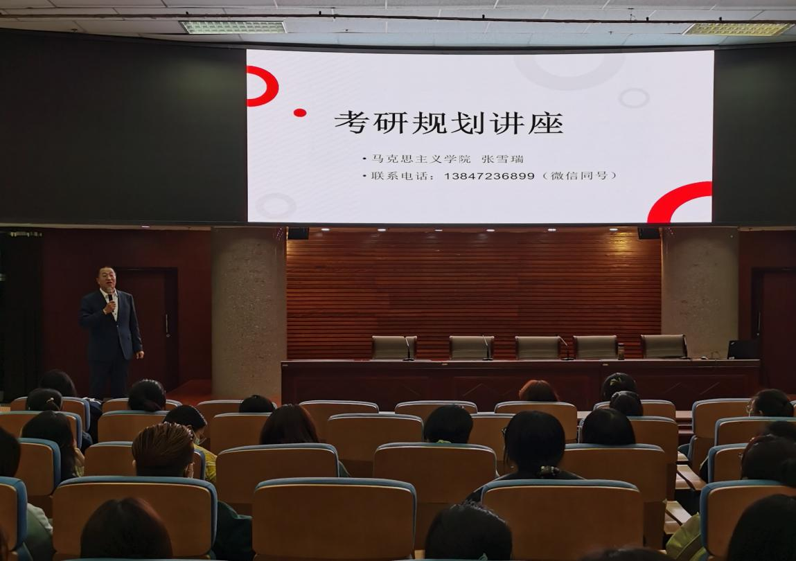 经管学院17级金融班的李瑞华同学报考了内蒙古财经大学,她结合自己考研的亲身经历,建议同学们树立考研信心,调整好备考心态。化学学院17级化学班田晓燕同学报考了大连理工大学,她给我们分享了如何取得笔试高分、如何有效安排考研各科的复习和作息等问题。我校研究生学院19级中国史专业牛政威同学作为复试经验的学长代表就考研复试的准备、复习资料的选取、以及复试过程中的小技巧和礼貌做了自己的分享。张雪瑞老师做了“考研规划”讲座。他结合往届考研报考、录取数据进行分析,从近几年考研政策对同学们带来的“考研福利”、考研人数及未来考研趋势和复习考研相关科目等问题入手,给同学们详细分析和指导了怎么规划考研。