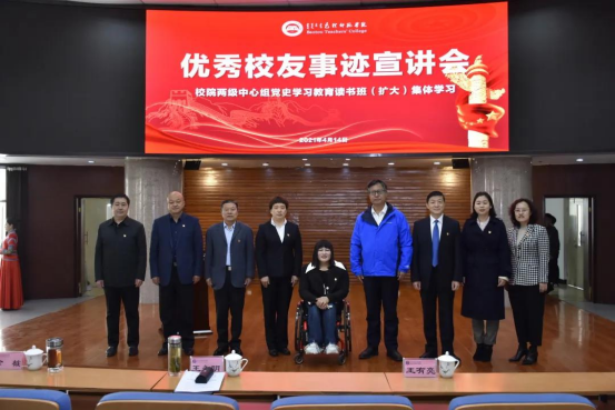 为深刻认识开展党史学习教育的重大意义,切实把思想和行动统一到党中央决策部署上,全面抓好贯彻落实,理解把握“学史明理、学史增信、学史崇德、学史力行”的目标要求,切实增强开展党史学习教育的针对性,进一步强化理论武装、坚定理想信念、赓续精神血脉、做到知行合一。为引导我校师生学习先进典型,争做爱党爱国的奉献者,4月14日,学校组织举办校院两级中心组党史学习教育读书班(扩大)集体学习——优秀校友事迹宣讲会。此次宣讲会邀请到我校优秀校友外国语学院2000届毕业生——“全国劳动模范”、“残奥会冠军”边建欣和体育学院2008届毕业生——“全国三八红旗手”、“全国脱贫攻坚先进个人”齐晓景作报告。校领导王永明、金桩、施纪华、王有亮、双山、格根哈斯及全校副处级以上干部、全体教工党员和外国语学院、体育学院全体学生党员参会。宣讲会由校党委副书记施纪华主持。
