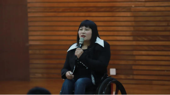 边建欣校友以“强化社会主义核心价值观 凝聚奋进新时代强大精神力量”为宣讲主题,从“接受自己”、“活出自己”、“绽放自己”、“给出自己”和“把爱传递”五个方向分享了她的励志人生。“花开蝴蝶来”,她是中国第一位女子残疾人举重冠军和残奥会冠军,在十五年的体育生涯中共为祖国夺得17枚国际金牌,40多次打破世界记录,创造了只要参加重大比赛,金牌绝不旁落的神话;她作为中共十七大代表,为祖国残疾人事业发展建言献策;作为2008年中国申奥形象大使,为中国在国际上树立了良好的残疾人阳光形象;作为世界人权宣言发布60周年亚洲代表发言人,充分展示了中国人权;作为包头市残联党支部专职副书记,立志将党的政策党的声音党的温暖传递给更多的残疾人兄弟姐妹;她勤奋工作,积极践行共产党人的初心使命,积极投身公益,影响全国各地的社会各界爱心人士、企业家从物质上、精神上关心帮助弱势群体;她自强不息、热爱生命、热爱生活,用生命谱写着无悔人生,用行动践行社会主义核心价值观,用拐杖书写了精彩人生。宣讲中,她呼吁广大师生关注和支持残疾人事业,争做“立大志,行大愿”的社会主义核心价值观践行者,争做爱的传递者,让世界听到中国人幸福的声音。