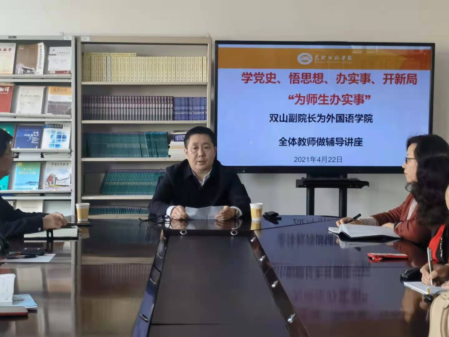 根据《包头师范学院关于开展党史学习教育的实施方案》和党史学习教育读书班活动安排,为积极贯彻落实校党委关于党史学习教育工作的部署要求,更好推进党史学习教育落地生效,积极为师生办实事,办好事。开学初,外国语学院对老师们在科研方面存在的困惑进行了深入调研,并对老师们提出的问题进行了梳理。针对老师们急需了解和长期困扰的问题,4月22日,外国语学院邀请校领导双山结合党史学习教育为全体教师开展讲座,全院教师聆听了双山同志的精彩讲座。