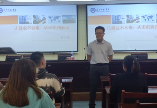 讲座中郭志峰老师以生动的事例、轻松的表达,从“求职——理性:努力不轻易浪费;开放:机会如汪洋大海”、“简历——要简,但不简单”、“面试——最重要的是准备好你自己”三个方面进行了讲解。讲座通俗易懂、深入浅出,不时获得在场同学们的掌声和欢笑。