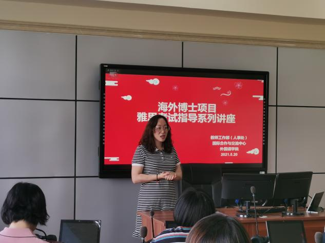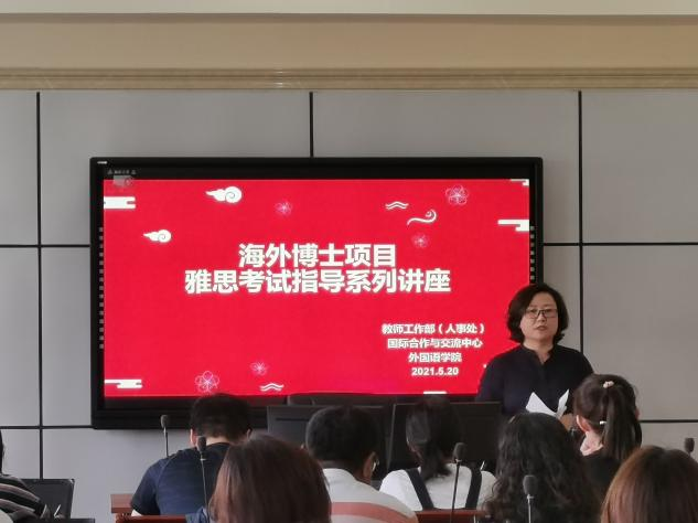 为扎实落实党史学习教育“我为师生办实事”,进一步做好“我是共产党员,我帮你”“我是志愿者,我帮你”服务活动,为帮助申请攻读海外博士项目教师提高英语考试能力,由教师工作部(人事处)联合国际合作交流中心组织,外国语学院承办“海外博士项目雅思考试指导系列讲座”。讲座于2021年5月20日至5月26日在新逸夫楼328室进行,本次讲座由国际合作与交流中心副主任杨文婷老师主持,我校外籍老师刘芳、外国语学院党支部书记张茂林、副院长赵阿茹娜及翻译系主任曲悦珍及52名教师参与。