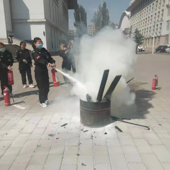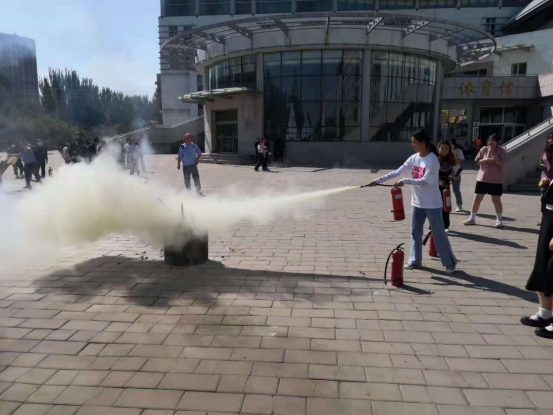 演习结束后,消防专业人员带领参演师生在体育馆门前广场进行了灭火器实操演练。