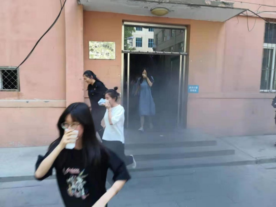 下午14:30,演练活动在3号学生公寓楼准时开始。为最大限度还原火灾的真实性,各楼层点燃消防用烟雾弹,指挥员下达疏散指令后,全体参演人员本着就近原则分别从东西两个楼梯和安全出口进行撤离,行动快速有序,达到了演练预期目的。