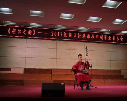 音乐会上,他用低音四胡为大家表演了蒙古族传统说唱艺术、第一批国家级非物质文化遗产乌力格尔、好来宝及2008年入选为第二批国家级非物质文化遗产的科尔沁叙事民歌,一首热烈欢腾、英姿雄发的四胡独奏曲《战马》将音乐会推向高潮,整场晚会体现了浓厚的中华民族一家亲情怀,受到现场师生的一致好评,也为额日恒满都拉四年的大学生活画上了圆满的句号。(音乐学院)