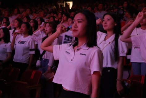 全体党员共同高唱《没有共产党就没有新中国》,党旗挥舞,掌声经久不息。
