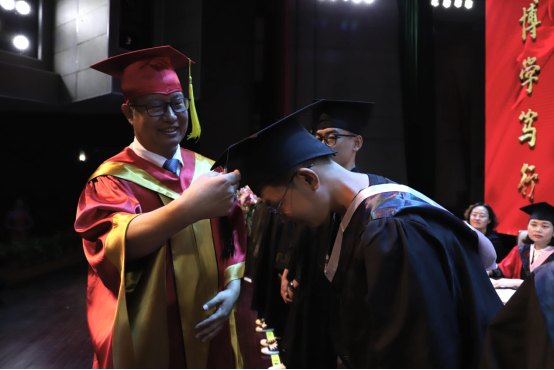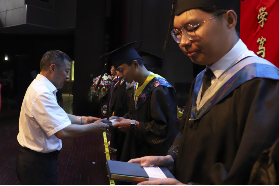 学位评定委员会主席、校长金桩为毕业生代表拨穗并颁发毕业证书、学位证书。